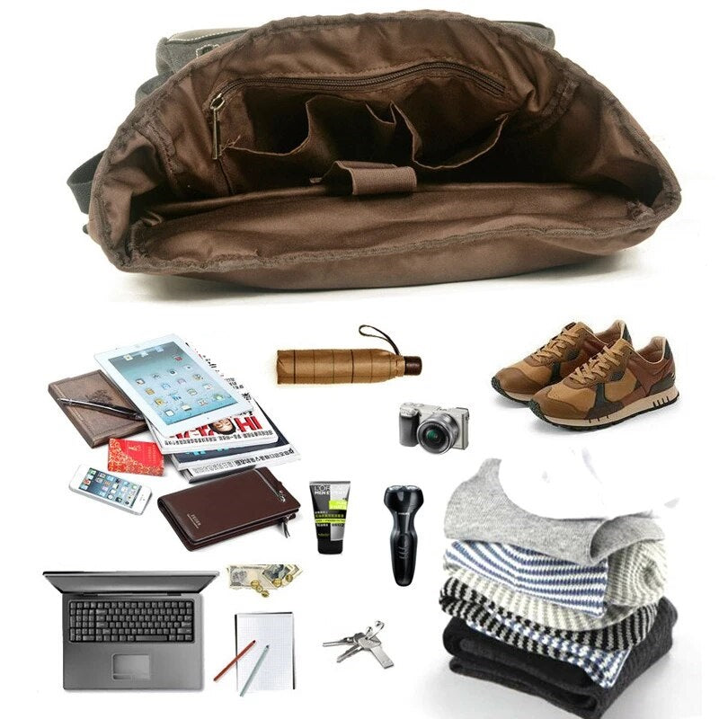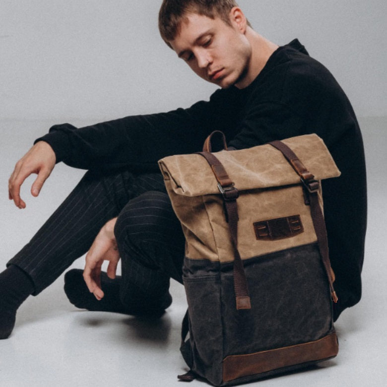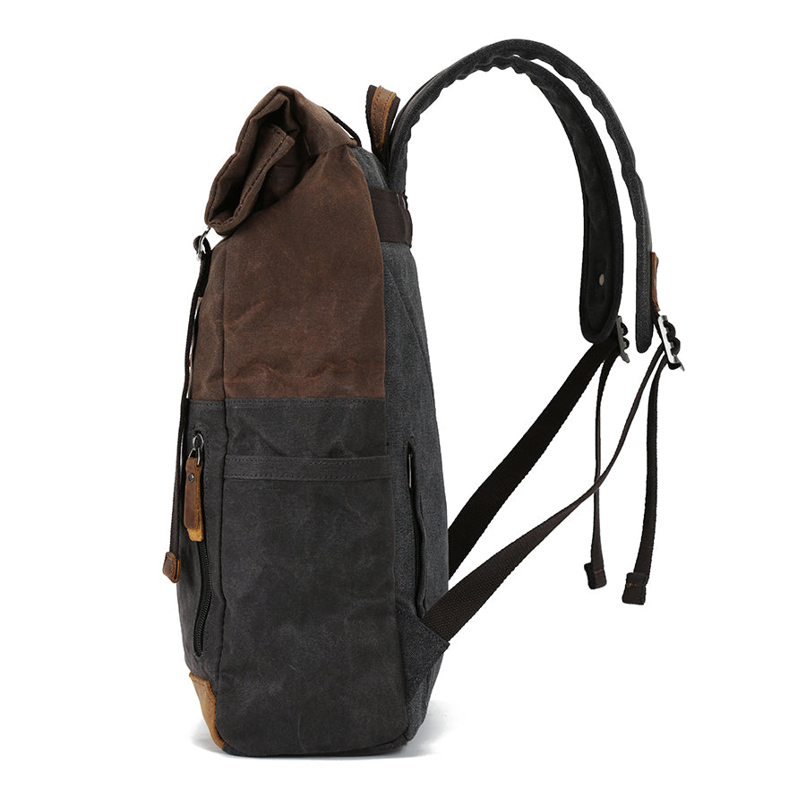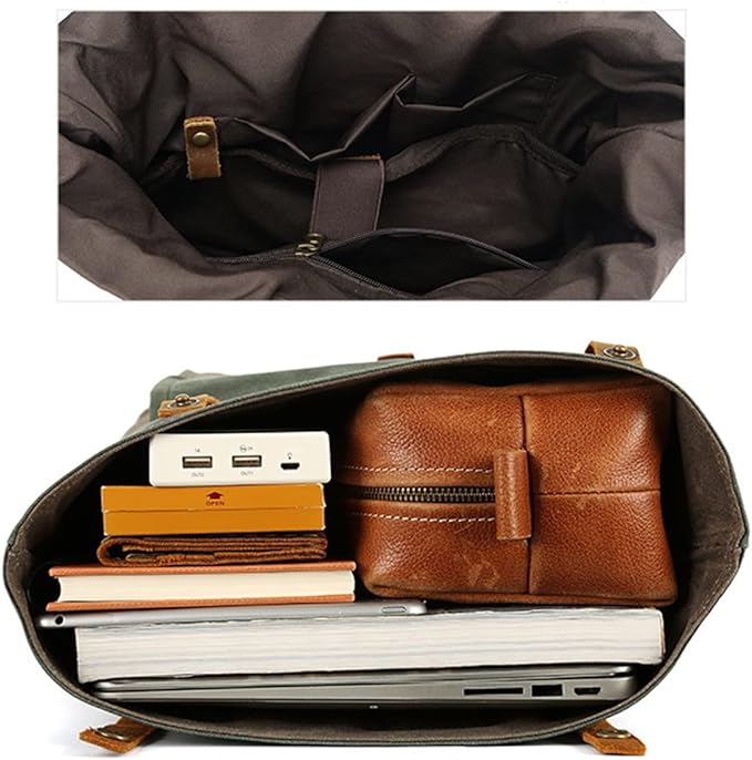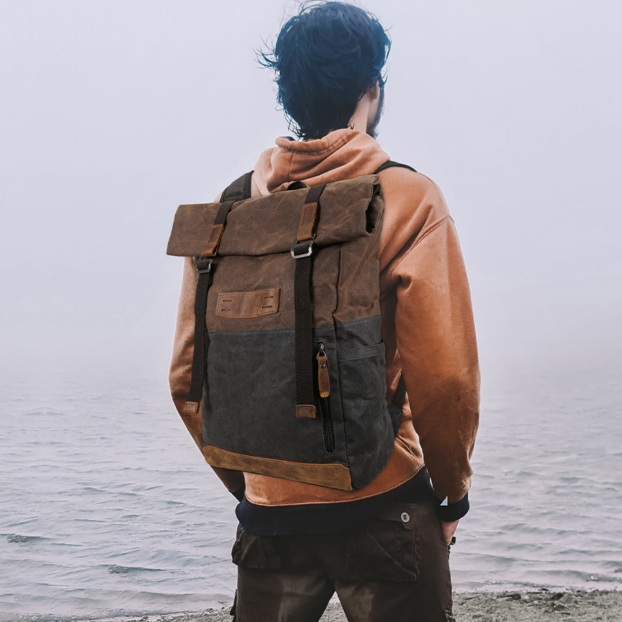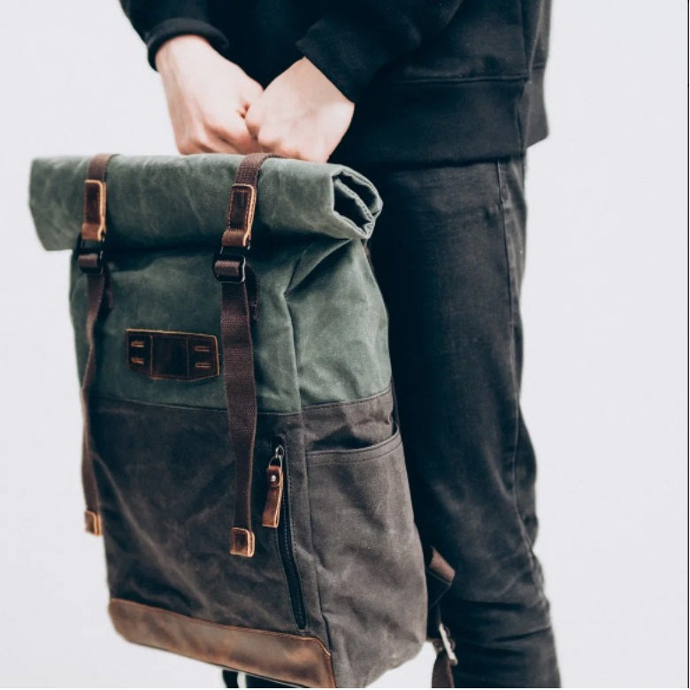 De lona encerada con tapa enrollada y correas con ganchos antirrobo. Bolsillo frontal y bolsillo posterior secreto. Compartimientos en los costados y sector especial para el cuaderno en la parte interior.